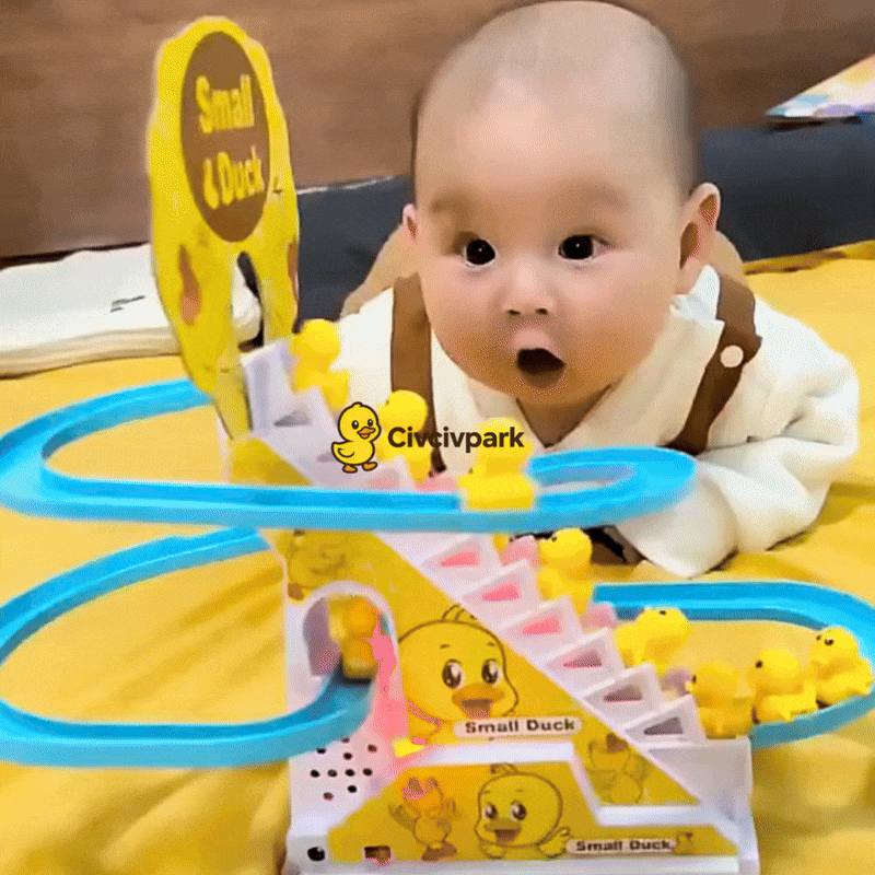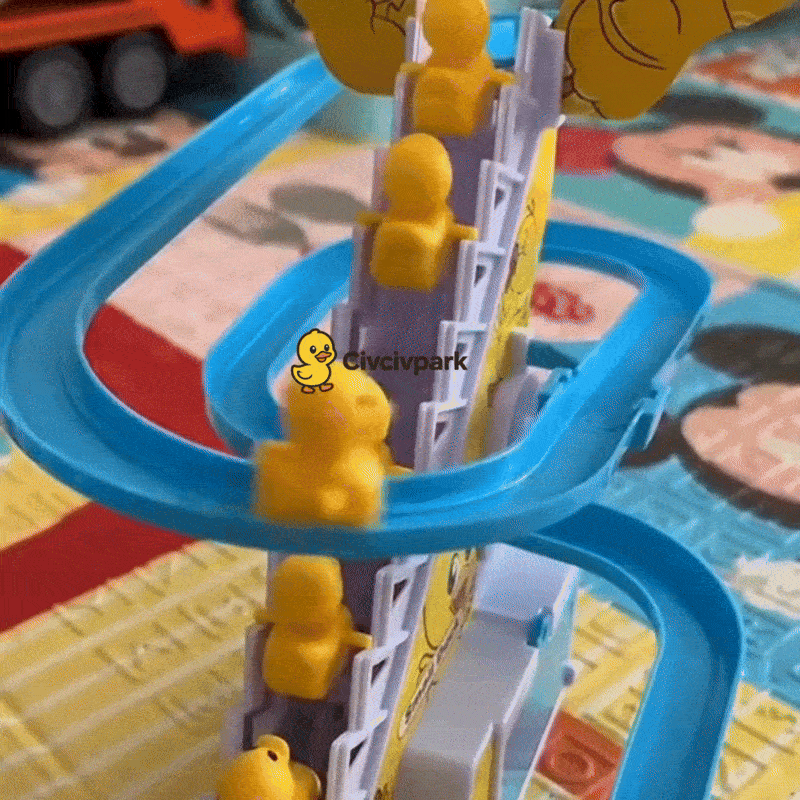Mini civcivler merdivenden yukarı çıkar, kaydıraktan aşağı kayar ve tekrar oyuna döner! Çocuklar için eğlenceli bir döngü oluşturur.