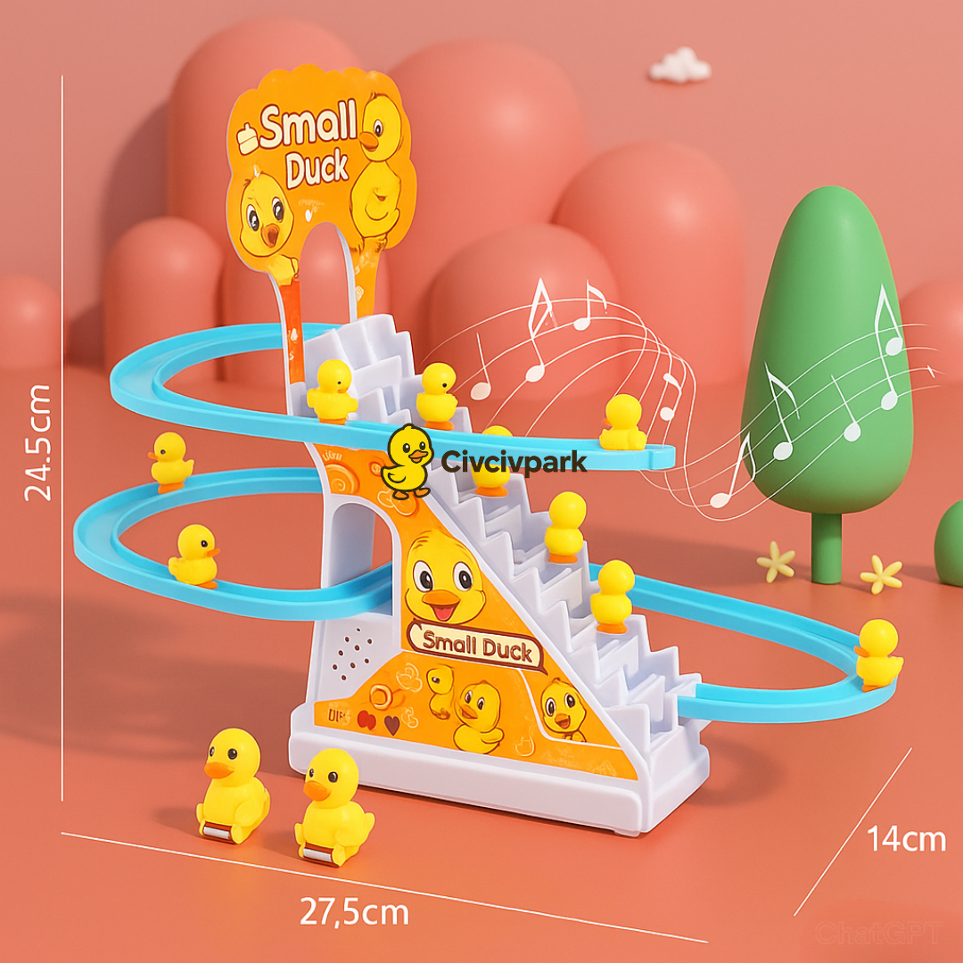 🔋 Civcivpark pille çalışır. Küçük sarı ördekler merdivenlerden yukarı çıkar, kaydıraktan aşağı kayar. LED ışıklar ve müzik sistemi ile çocuklara eğlenceli bir oyun deneyimi sunar.